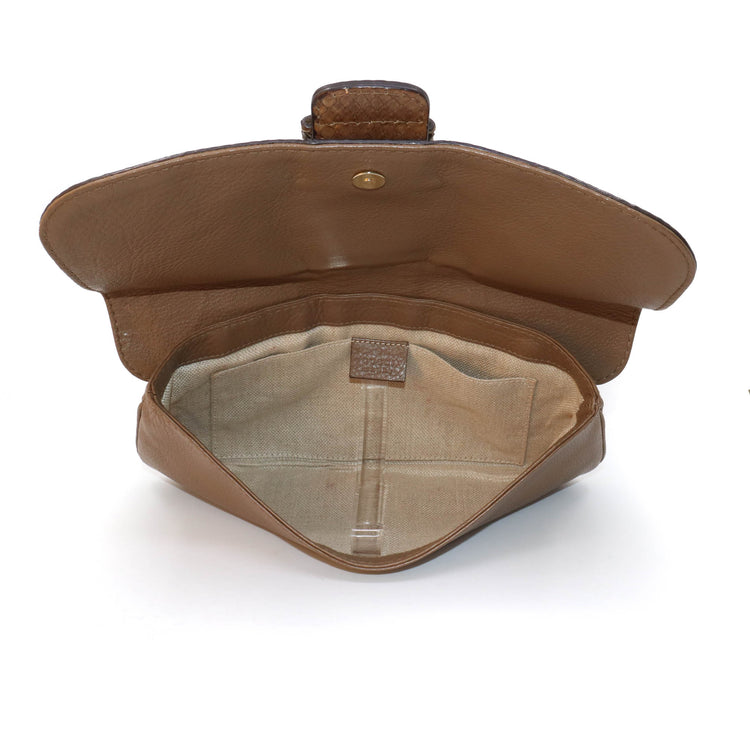Cartera de mano tipo clutch Gucci, finamente elaborada en piel suave color marrón, con detalle de piel de víbora en la solapa y adornos del cierre. La solapa cierra una base de botón magnético a presión, elegantemente adornada con un herraje metálico en color dorado con la marca grabada. El interior está forrado en lona blanca y cuenta con un bolsillo plano.