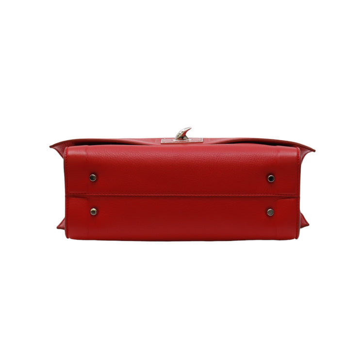 Bolso marca Givenchy modelo Shark, confeccionado en suave piel de becerro color rojo, forro interno en ante color nude con herrajes plateados, solapa al frente con broche giratorio, cuenta con un asa superior rígida de piel y una bandolera extraíble en mismo color.