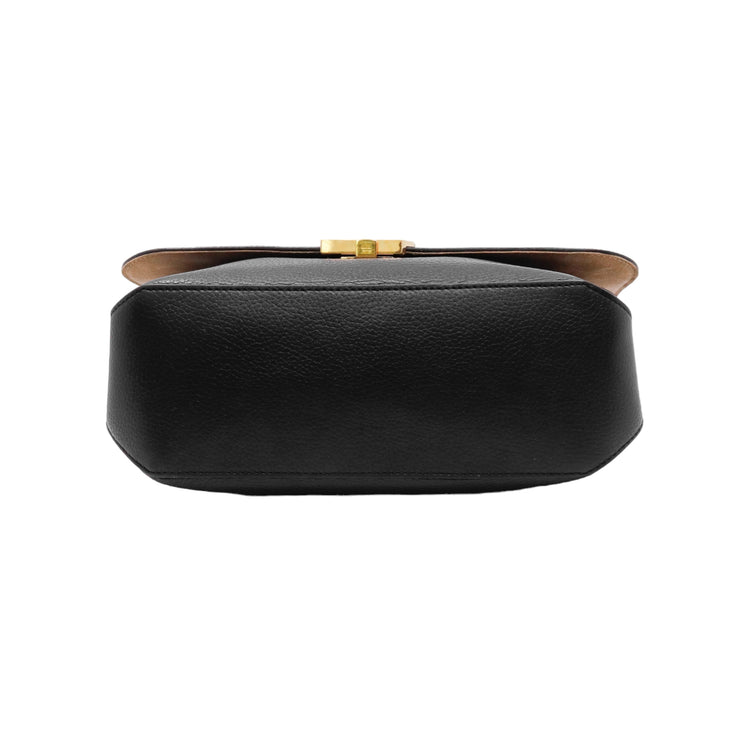 Bolso de la marca Louis Vuitton modelo Volta, confeccionado en suave piel color negro, con 1 asa rígida, con logotipo LV en herraje dorado y cubierto con piel en la solapa, interior en ante nude con 1 bolsillo interno con cierre de cremallera, herraje poco rayado.