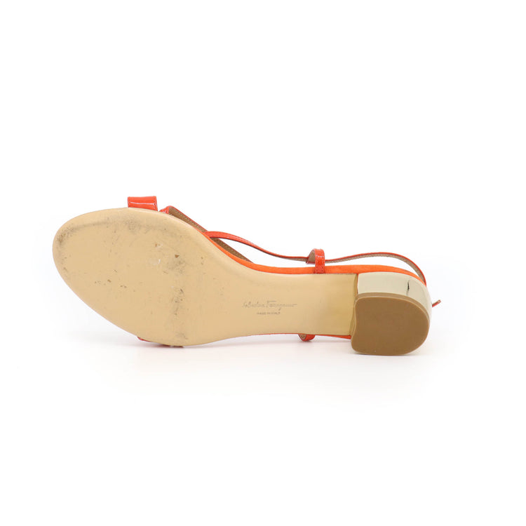 Sandalias Salvatore Ferragamo, elaboradas en charol con gamuza de color naranja, puntera redonda abierta con aplicación de un moño en la parte frontal, correa ajustable en los costados del empeine, con tacón bajo.
