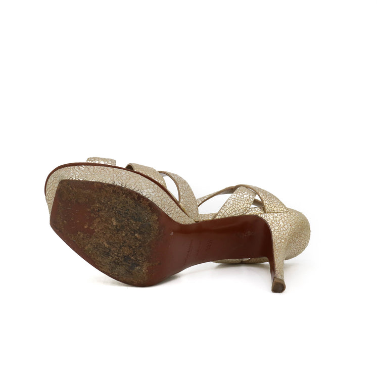 Sandalias de tacón Tribute de Yves Saint Laurent, finamente confeccionadas en piel natural color dorado efecto craquelado, con las tiras características del modelo al frente y empeine, hebilla ajustable al tobillo. Tacón y plataforma en el mismo tono.