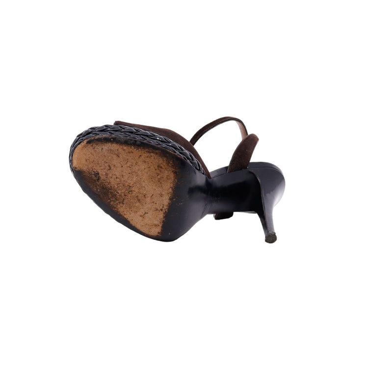 Zapatos tipo sandalia marca Yves Saint Laurent, confeccionados en ante café, con charol negro, plataforma de 2 cms y tacón de 13 cm, desgaste en suela por uso regular.